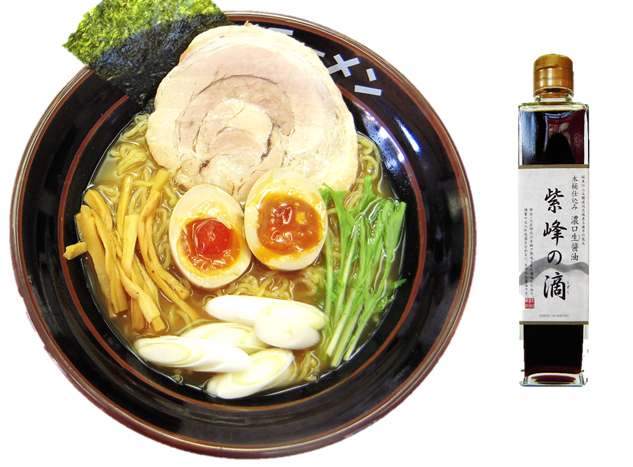 スープの種類は生醤油、白醤油、燻製醤油、塩、味噌、ゴマ味噌、焼味噌の7種類、特に生醤油ラーメンは当店イチオシ!地元醤油メーカーの生醤油「紫峰の滴」が豚骨・牛骨ベースのスープのうま味と魚介の風味を一層引き立たせます。