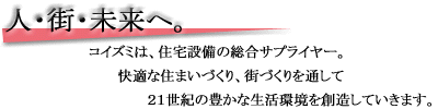 これからも小泉東関東は、時代の要請に応えるべく住まいのアメニティを創造した住宅設備機器を、すべてのお客様の為に、お客様の喜びの心にお応えしていくために、社員が「人・街・未来へ」をスローガンとして未来へ挑戦して参る所存でございます。