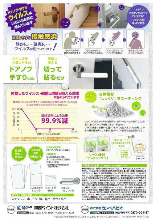 会員事業所検索 (株)奥広 サービス一覧 概要 【ウイルス対策シート】 「ウイルス対策」接触感染対策に、ドアノブ・手すりに切って貼るだけ。 自然素材「しっくい」をコーティング!! 効果持続期間 約6ヶ月 幅10cm×長さ20cm/3枚入(白)1,450+税(+送料370円 レターパックライト) 店舗情報 定休日 日曜日 営業時間 9:00~18:00 所在地 〒300-0871 土浦市荒川沖東3-3-2 OGビル2階 TEL:029-896-6593 FAX:029-896-6594