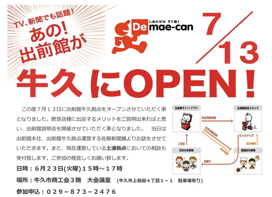 会員事業所検索 出前館 牛久にOPEN! サービス一覧 現在運営している土浦拠点においての相談も受け付けいたします。 ご参加のほど、よろしくお願いいたします。 概要 「出前館」牛久拠点がオープンします! (2020年7月13日(月)~) それに伴い、飲食店様向け説明会を下記の通り開催します。 日時:6月23日(火)15時~17時 場所:牛久市商工会 3階大会議室 (牛久市上柏田4丁目1-1)駐車場あり 参加申し込み:029-873-2476 へお電話ください。 佐藤新聞舗 出前館事業部 牛久市刈谷町2-172-13 info@asa-satou.com 店舗情報 定休日 営業時間 所在地 〒300-1235 牛久市刈谷町2-172-13 TEL:029-873-2476