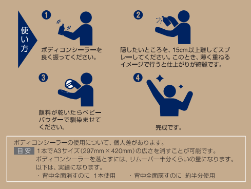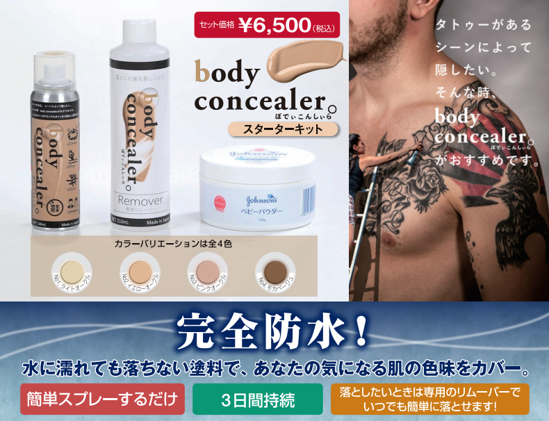 会員事業所検索 ヤマグチ土浦ボクシングジム 概要 タトゥーがある。シーンによって隠したい。そんな時は「body concealer(ぼでぃこんしぃら)」がおすすめです。 気になる部分に簡単スプレーするだけ。完全防水・効果は3日間。落としたいときは専用リムーバーでいつでも簡単に落とせます。 カラーバリエーションは4色。 1本でA4用紙2枚分(おおまかに背中全面分)施せます。 お値段は、リムーバーとセットで税込6,500円。 店舗情報 定休日 営業時間 所在地 〒300-0031 土浦市東崎町11-25 TEL:090-3505-6764